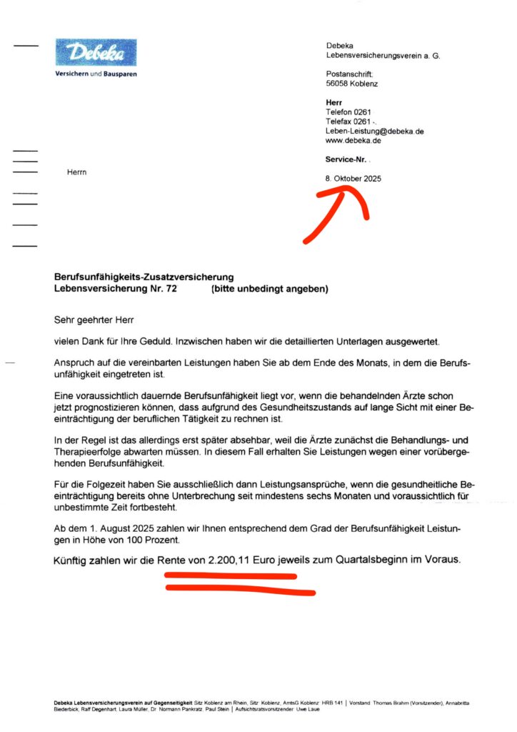 Ein beeindruckender Erfolg: Die Debeka hat den Leistungsantrag auf Berufsunfähigkeitsrente unseres Mandanten innerhalb von nur sechs Tagen vollständig bearbeitet und anerkannt – eine Bearbeitungszeit, die normalerweise mehr als ein halbes Jahr dauert.