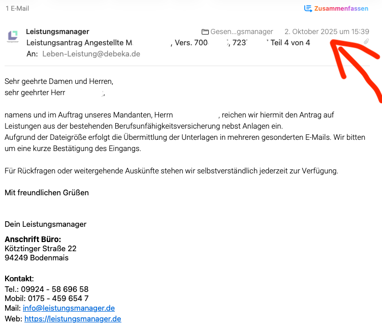 Unser Antrag ging am 2. Oktober 2025 bei der Versicherung ein – das Anerkennungsschreiben datiert vom 8. Oktober 2025.