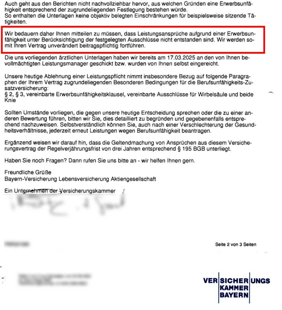 In einem aktuellen Leistungsfall wurde der Antrag unseres Mandanten auf Leistungen aus seiner Berufsunfähigkeitsversicherung zunächst abgelehnt. Die Begründung der Versicherung: