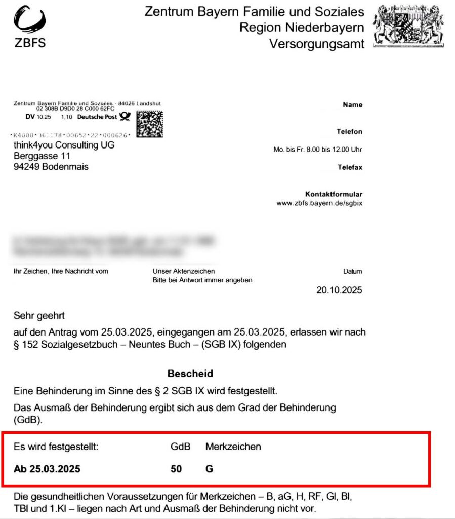 Für unseren Mandanten wurde ein Grad der Behinderung (GdB) von 50 % festgestellt.