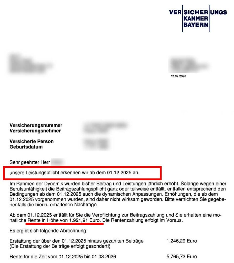 Wie dem Anerkennungsschreiben der Versicherung zu entnehmen ist Leistungserklärung vom 10-02-2…, erhält unser Mandant nun: